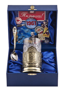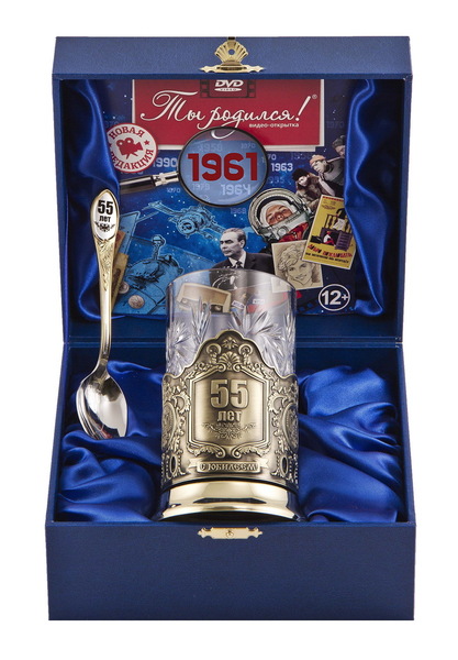 Набор для чая "55 лет"(3 пр.)- дерев. футляр, хруст.стакан,латунь,штамп,гравировка,ложка-нерж.грав.,Видеооткрытка"Ты родился!" 1960 г.