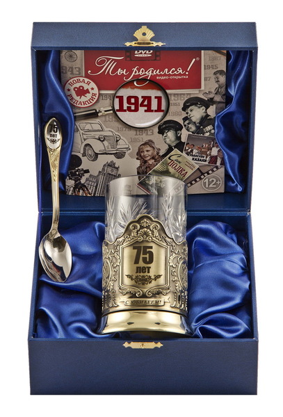 Набор для чая "75 лет"(3 пр.)- дерев.футляр, хруст.стакан,латунь,штамп,ложка-нерж.грав.,открытка"Ты-родился!" 1940 г